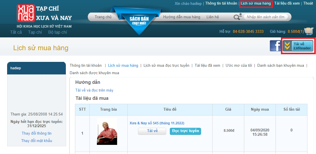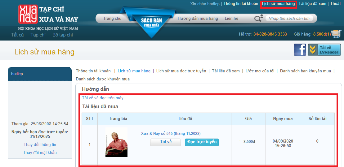 Sau khi thanh toán thành công, bạn vào trang sachbaohay.com vào phần Lịch sử mua hàng để kiểm tra thông tin sách vừa mua được.